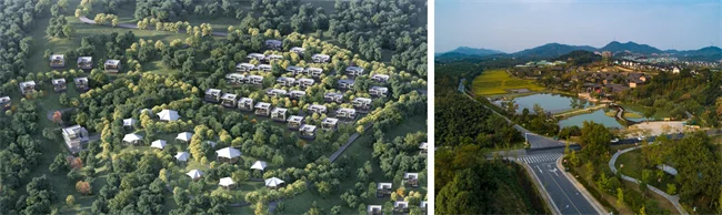 “诸暨春风十里 Sólarfrí 度假酒店”则以自然山丘为底色,布局 31 栋主体客房区、13 栋帐篷区及茗庐等住宿空间,周边环绕毛竹坪岗、十里坪、枫谷线等自然景观。项目聚焦“田园艺术 + 无动力游乐”,融入生态观景台、亲子手作体验等元素,家庭可在山林间享受露营乐趣、在自然中开展亲子互动,既体验到远离喧嚣的松弛感,又能在开阔的自然场景中,感受如塞上粮仓般阳光下的自在与快乐,打造“春风与山丘共生”的度假氛围。